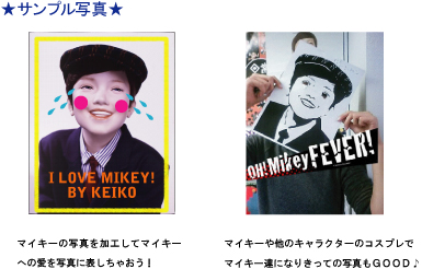 東京・大阪の会場にいるマイキーたちを撮影して、携帯画像に自由にスタンプを押してみたり・加工してみたり…、マイキーやエミリーちゃん等のキャラクターのコスプレしてみたり…テーマは自由!!!